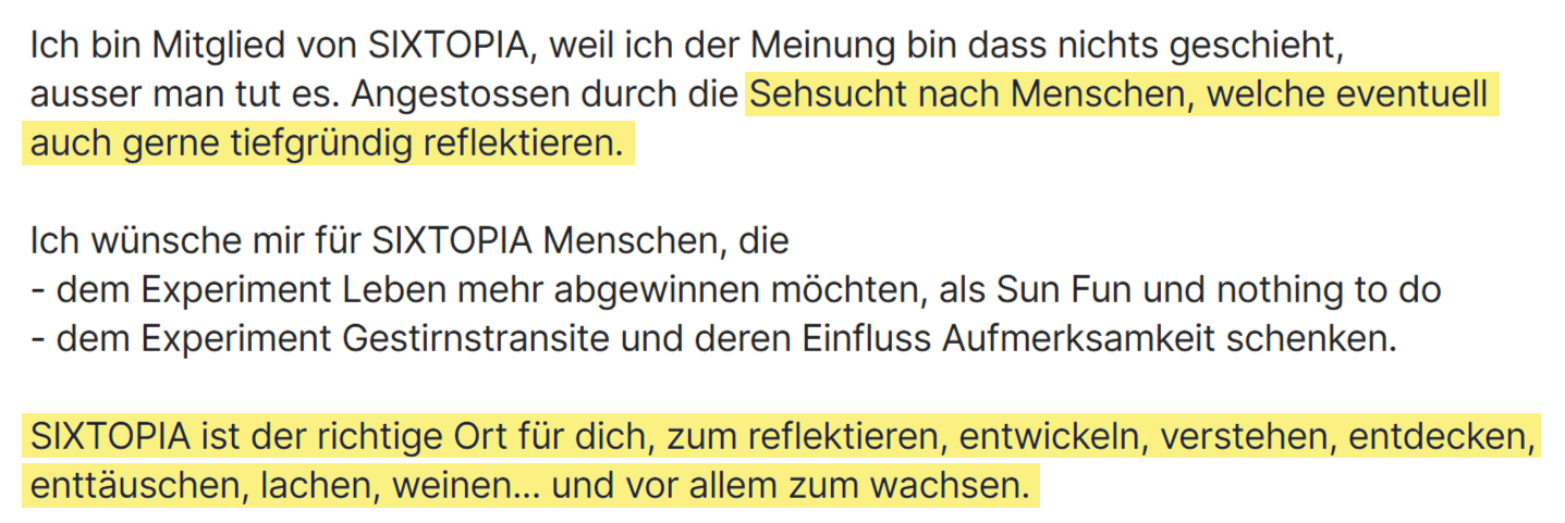 Verbindung und Austausch mit „likeminded” Menschen zu finden, gemeinsam zu reflektieren, zu wachsen und zu kreieren.