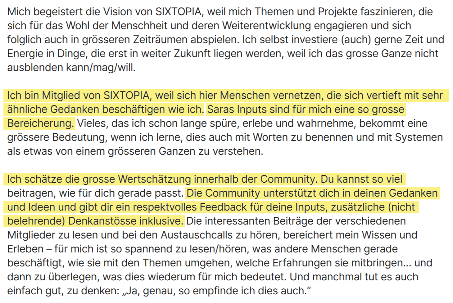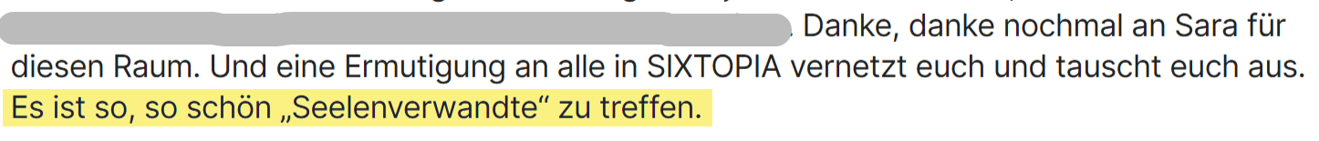 Sobald du hier deine Mitgliedschaft abgeschlossen hast bekommst du einen Link und eine Anleitung, um dich auf der Community-Plattform zu registrieren. Nachdem Sara deine Registrierung geprüft hat, schaltet sie dich für SIXTOPIA frei. Du kannst dort direkt mit den anderen Mitgliedern in den Austausch gehen und dich gerne der Community vorstellen.